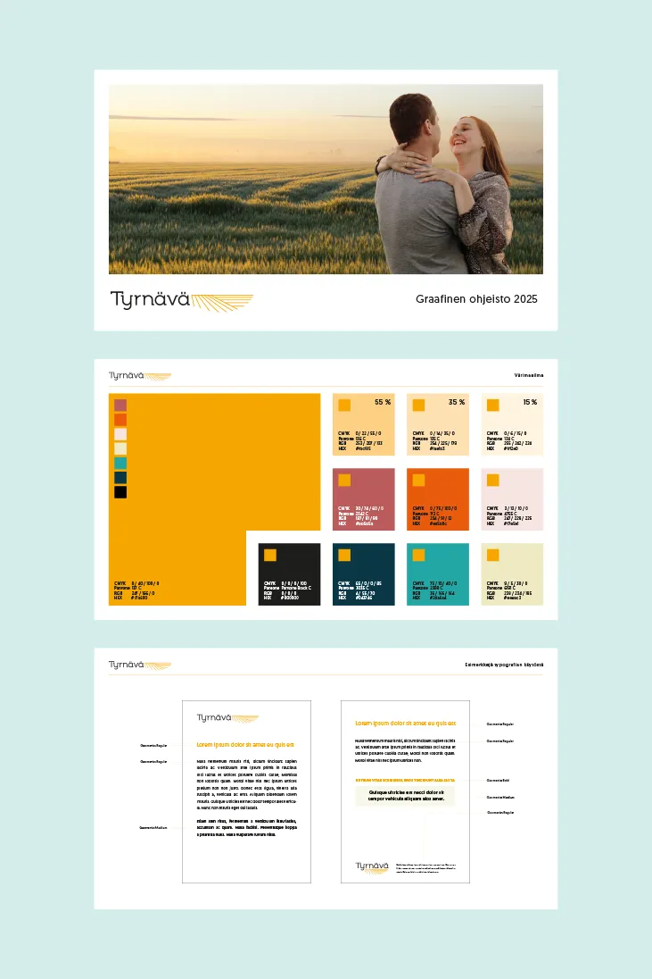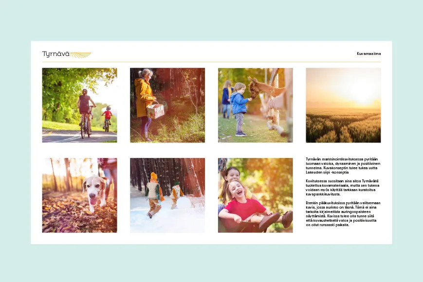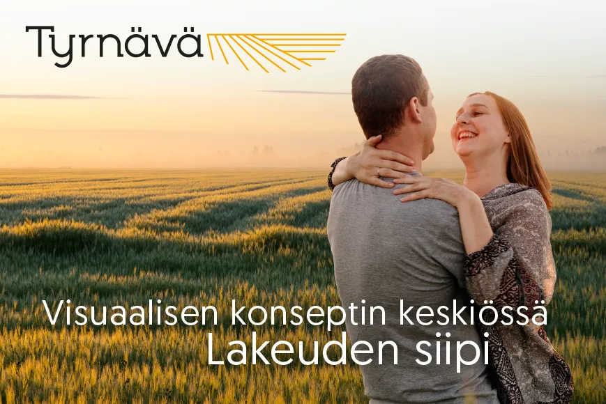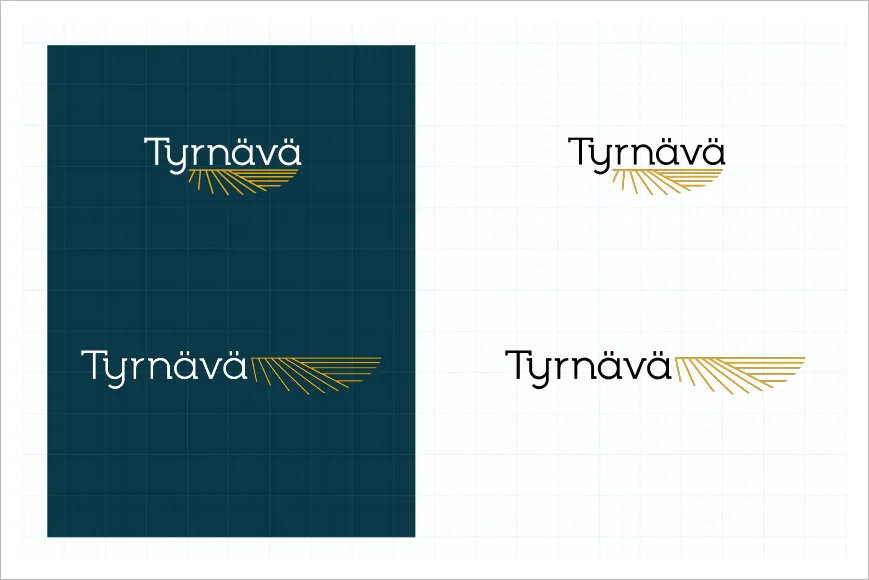 Lakeuden siipi joustaa ja elää. Se voi muuttaa muotoaan ja toimia myös logon tekstiosasta erillään, nivoen aina visuaalisen kokonaisuuden yhteen. Elementti tuo Tyrnävän ilmeeseen tunnistettavuutta – samalla sen käyttö on helppoa ympäristöstä ja materiaalista riippumatta.