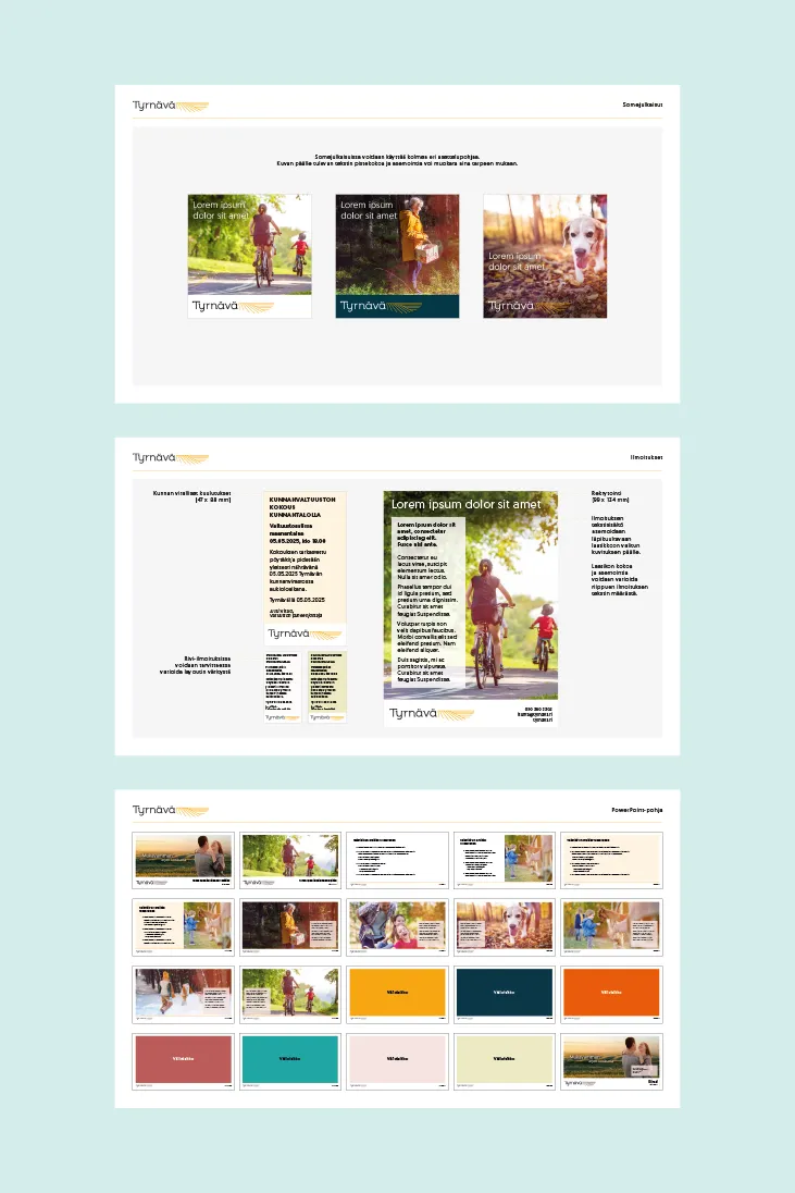 Jo ensimmäisessä vaiheessa graafiseen ohjeistukseen määriteltiinkin logon, typografian, värimaailman ja kuvakonseptin lisäksi kattavat materiaalit kunnan työntekijöiden arkeen: käyntikortit ja Office-pohjat, tapahtumajuliste, some- ja printtimainospohjat.